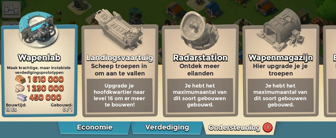Stel, je hebt voldoende grondstoffen om het wapenlab te bouwen en hij staat inmiddels te schitteren in de zon. Wat kun je ermee? Je hebt diverse experimentele wapens in verschillende levels. Hoe hoger het level hoe meer prototypen onderdelen je er voor nodig hebt. Wanneer je zo’n prototype wapen hebt gebouwd blijft deze twaalf dagen staan, slim is dus om voor die tijd al een nieuwe te hebben gebouwd zodat wanneer je oude in elkaar stort je meteen een nieuwe op de frontlinie kunt gooien!