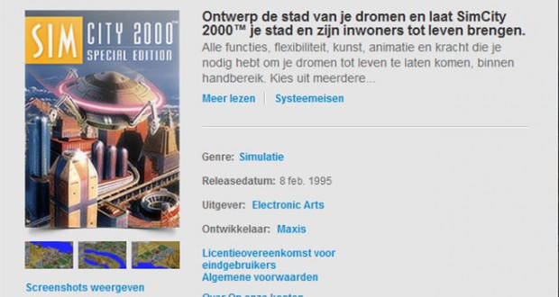 Normaal betaal je €5,99 voor deze klassieker, maar voor een onbekende tijd is hij gewoon helemaal gratis te downloaden. Het enige dat je nodig hebt is de Origin software voor jouw PC. Sim City 2000 Special Edition werkt niet op de Mac.