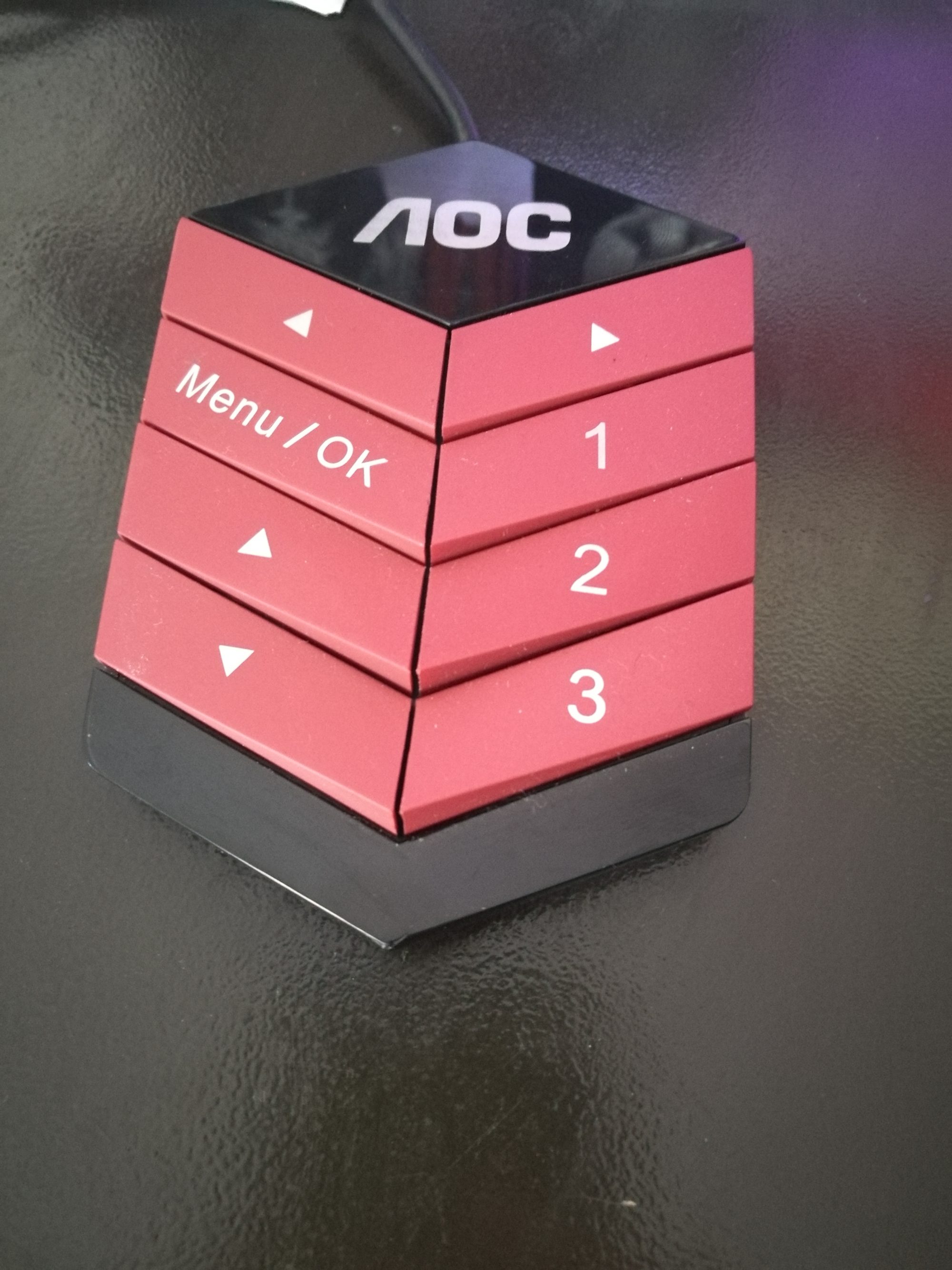 Als laatste, en zeker niet te vergeten, het regelkastje. Bovenaan wederom de letters in het wit AOC. Daaronder een 8tal rode knoppen die knoppen onder het beeldscherm overbodig maken. Een leuke toevoeging! Zeker omdat je zo snel verschillende modi kan instellen. Meer daarover later.