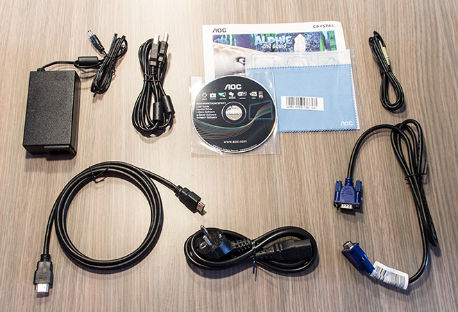 AOC levert de A2472PW4T met een netstroomadapter en netsnoer, een CD met de handleiding erop, een poetsdoek, een VGA kabel, een HDMI kabel en een 3,5mm kabel. Lekker compleet dus.