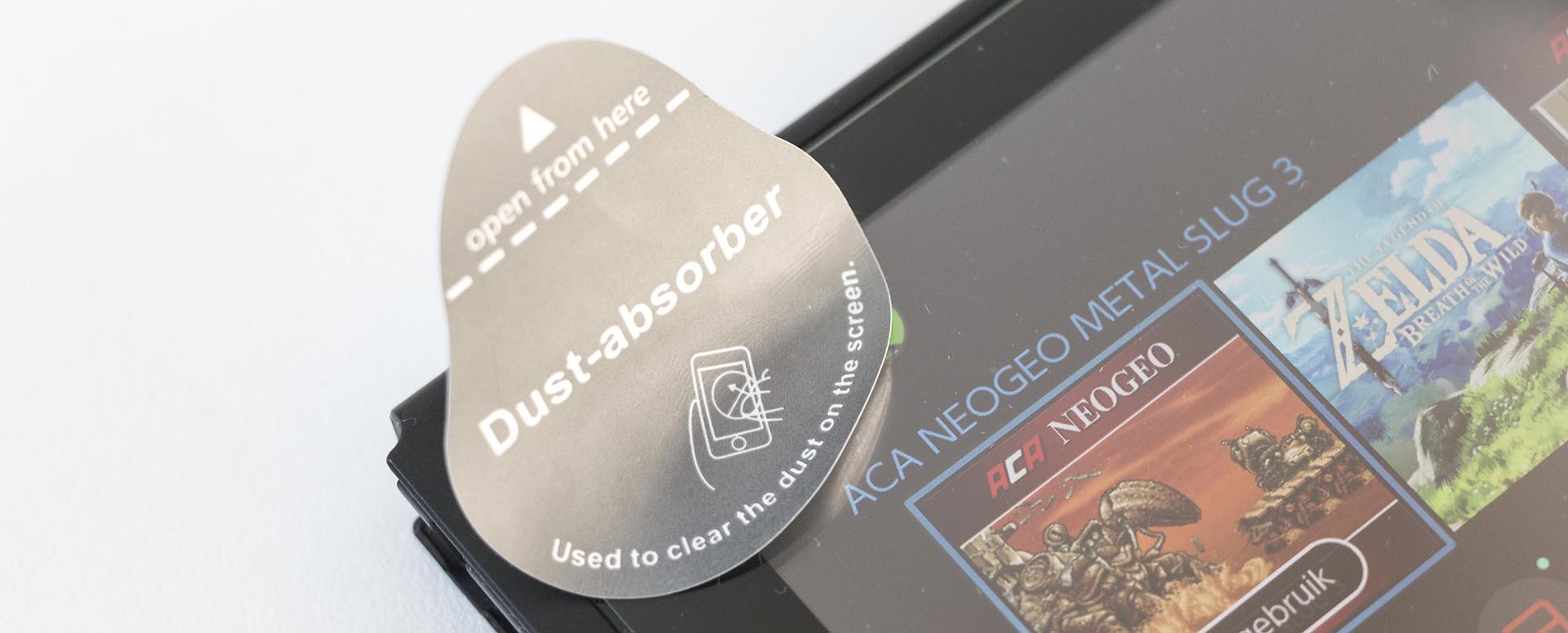 Voor je gaat plakken, moet het display van de Nintendo Switch brandschoon zijn. Begin met het meegeleverde brillendoekje en poets alles dat je ziet van het scherm. Hierna gebruik je de natte cleaning wipe om vet van het scherm te verwijderen en de dry cleaning wipe om resten van het schoonmaakmiddel weer van het scherm te halen.